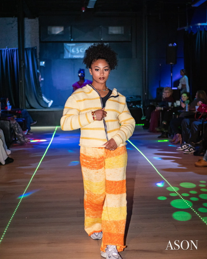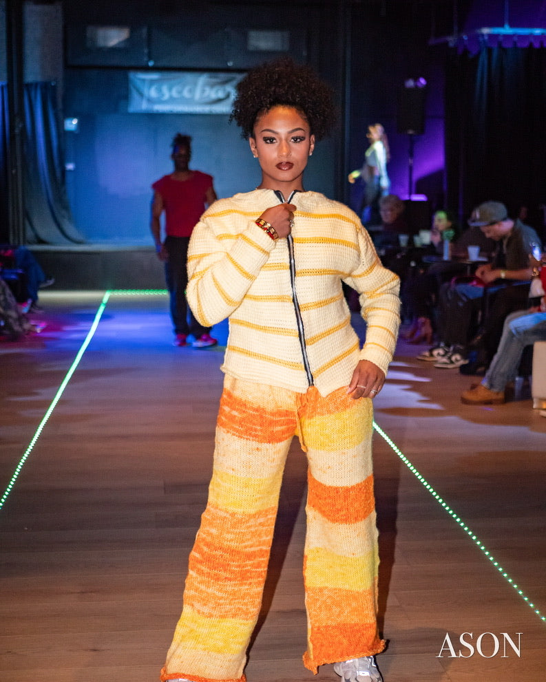 Tunisian crochet striped zipup sweatshirt made with second hand materials,